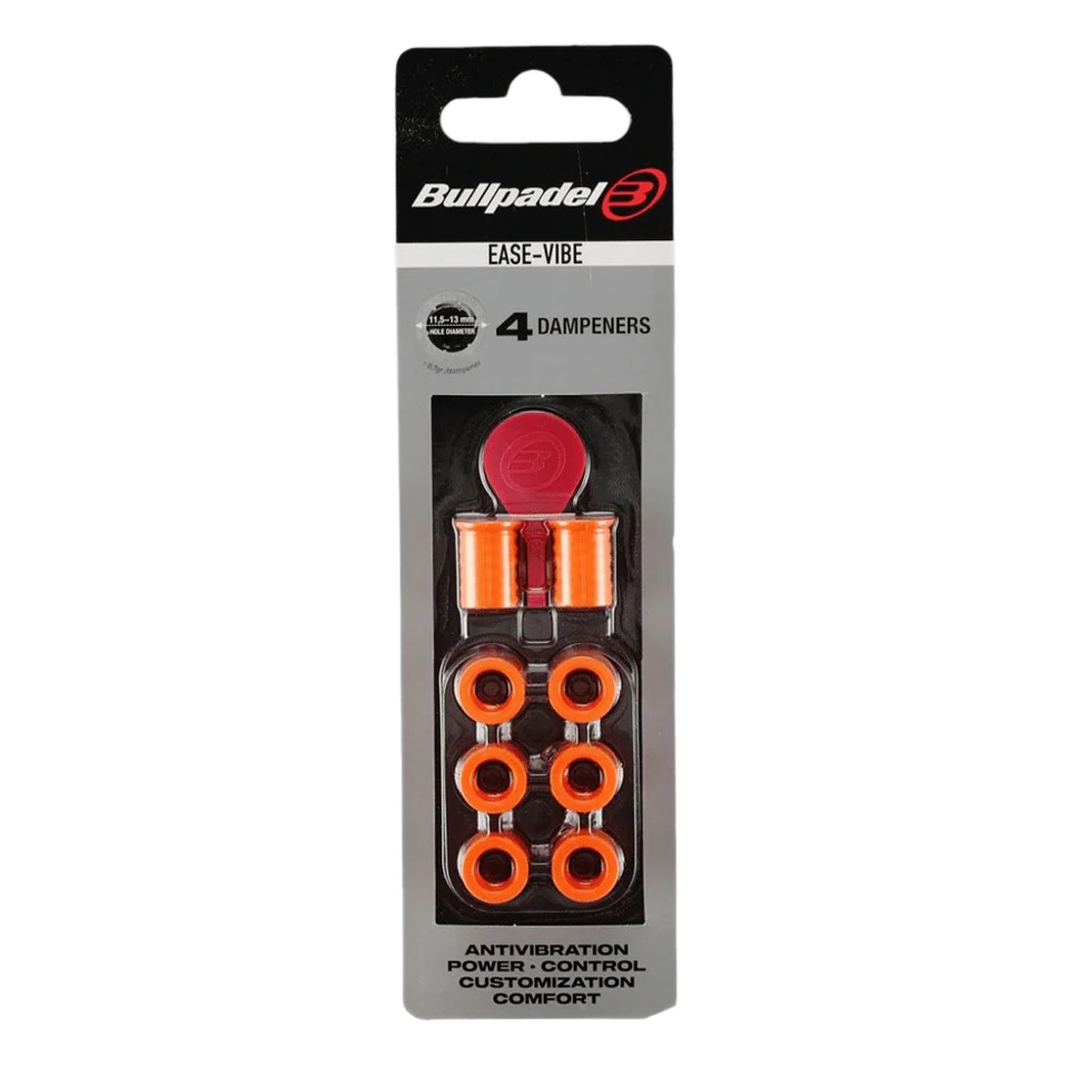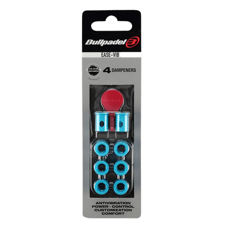 - Los dampeners BULLPADEL Ease-Vibe son accesorios pequeños y ligeros que marcan una gran diferencia en tu experiencia de juego. Diseñados para colocarse en los taladros de tu pala, son capaces de reducir hasta un 60% las vibraciones en el punto de impacto, brindándote un golpeo más cómodo y mejorando tu control.